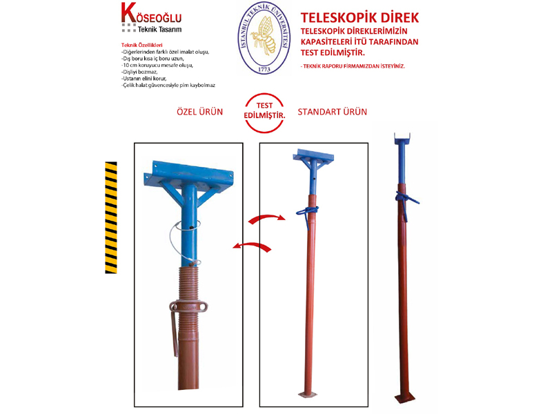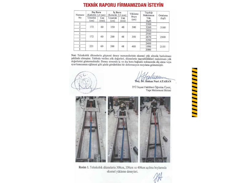Yüksek Taşıma Kapasitesi: İTÜ (İstanbul Teknik Üniversitesi) tarafından test edilmiş olan bu teleskopik direkler, yüksek eksenel taşıma kapasitelerine sahiptir. Test sonuçlarına göre, direklerde herhangi bir diş atması veya ayar kancası eğilmesi gibi deformasyonlar meydana gelmemiştir. Bu, ürünün güvenilirliğini ve dayanıklılığını kanıtlar niteliktedir.